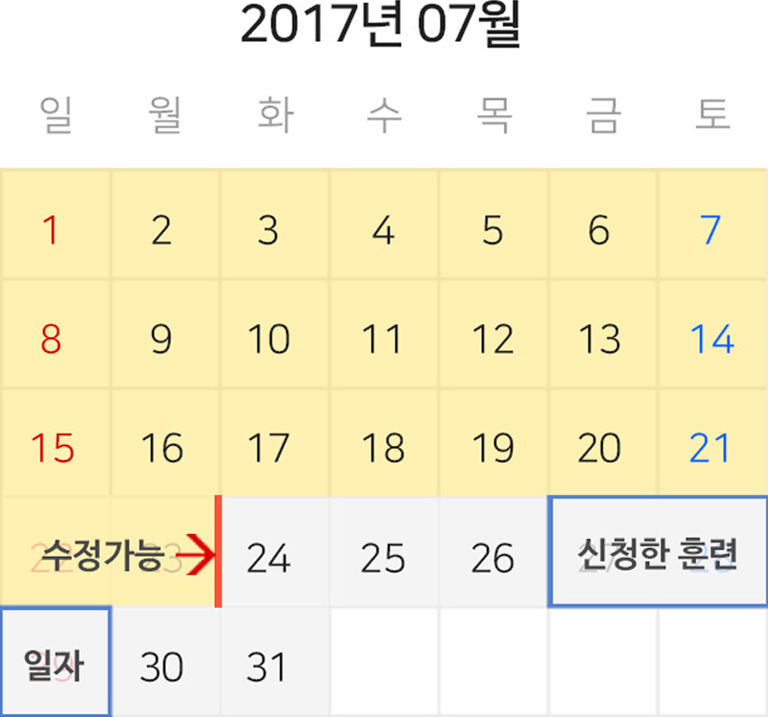 - 예) 7월8일 훈련의 경우 7월4일(23:59)까지 수정 또는 삭제가능합니다.